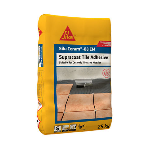 SikaCeram®-88 EM is a one-pack premixed cementitious tile adhesive containing, cement, polymers, quartz minerals and additives, for bonding ceramic tiles, porcelain tiles and mosaics to floors and walls.