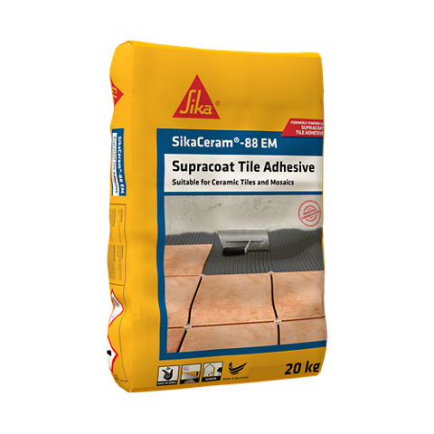 SikaCeram®-88 EM is a one-pack premixed cementitious tile adhesive containing, cement, polymers, quartz minerals and additives, for bonding ceramic tiles, porcelain tiles and mosaics to floors and walls.
