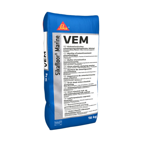 Sikafloor® Marine VEM is a 1-component damping, self-smoothing mortar based on polymer modified cement. It is specifically designed to be used in combination with Sikafloor® Marine-18, -118 FC or -190 mortars to reduce low frequency structure borne noise. Sikafloor® Marine VEM is tested according to FTP Code system and approved according to the IMO Marine Equipment Directives.